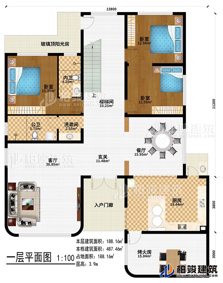 一層:入戶門廊、玄關、客廳、烤火房、廚房、餐廳、樓梯間、洗漱間、3臥室、內衛、公衛、玻璃頂陽光房